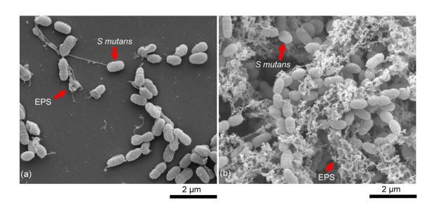Biofilms consist of bacterial cells surrounded by a matrix of extracellular polymeric substance (EPS), which protects the colony from many countermeasures, including antibiotic treatments. Growth and formation of bacterial biofilms are affected by nutrients available in the environment. In the oral cavity, the presence of sucrose affects the growth of Streptococcus mutans that produce acids that erode enamel and form dental caries. Biofilm formation on dental implants commonly leads to severe infections and can restrict osseointegration necessary for the implant to be successful. This work determines the effect of sucrose concentration on biofilm EPS formation and adhesion of Streptococcus mutans, a common oral colonizer, to titanium substrates simulating common dental implants. Biofilm formation and profiles are visualized at high magnification with scanning electron microscopy (SEM). Large mounds and complex structures consisting of bacterial cells and EPS can be seen in biofilms at sucrose concentrations that are favorable for biofilm growth. The laser spallation technique is used to apply stress wave loading to the biofilm, causing the biofilm to delaminate at a critical tensile stress threshold. The critical tensile stress threshold is the adhesion strength. Because laser spallation applies the stress loading to the rear of the substrate, bulk adhesion properties of the biofilm can be determined despite the heterogenous composition and low cohesion strength of the biofilm. Statistical analysis reveals that adhesion strength of biofilms initially increase with increasing sucrose concentration and then decrease as sucrose concentration continues to increase. The adhesion strength of bacterial biofilms to the substrate in this study is compared to the adhesion of osteoblast-like cells to the same substrates published previously. When sucrose is present in the biofilm growth environment, S. mutans adhesion is higher than that of the osteoblast-like cells. Results of this study suggest sucrose-mediated S. mutans biofilms may outcompete osteoblasts in terms of adhesion during osseointegration, which could explain higher rates of peri-implant disease associated with high sugar diets. Further studies demonstrating adhesion differentials between biofilms and cells including co-cultures are needed and motivated by the present work.